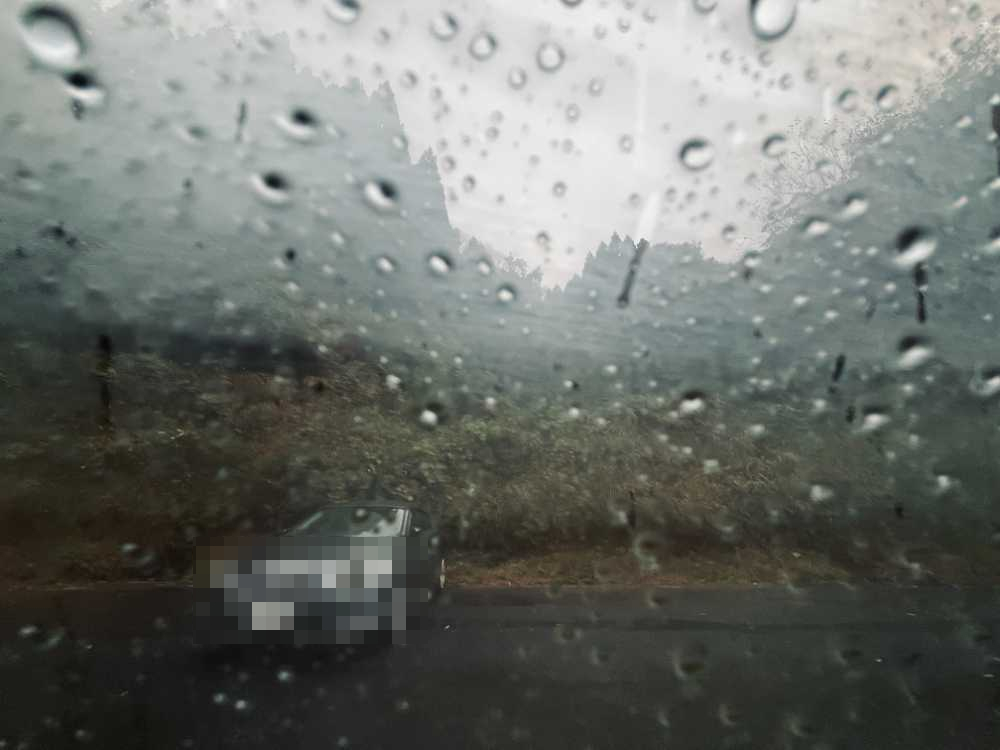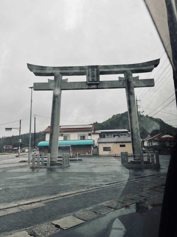 参道の、出雲でもとびきりでっかい石鳥居のお写真を車内から失礼します。濡れないし、あったかいし、かいてき〜。